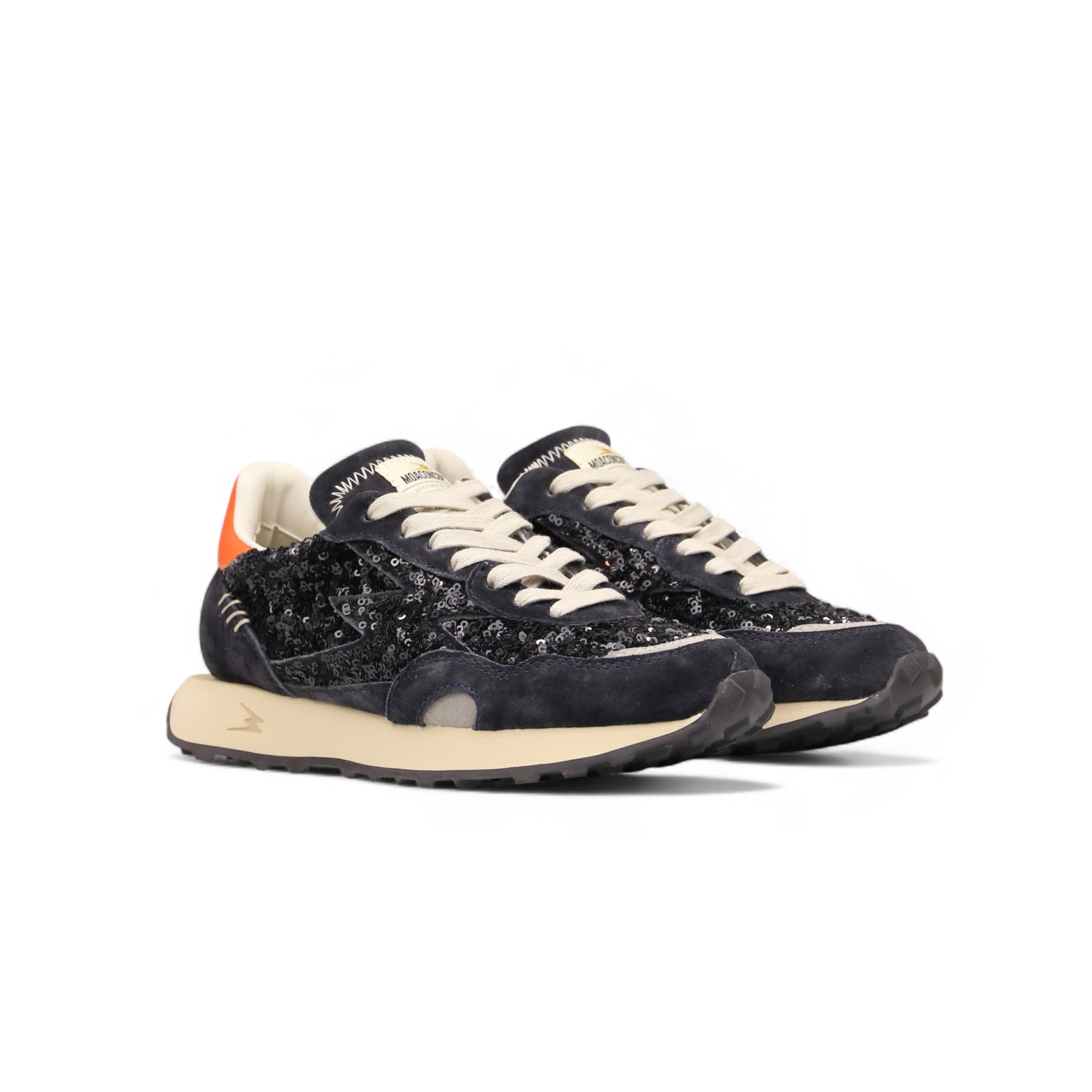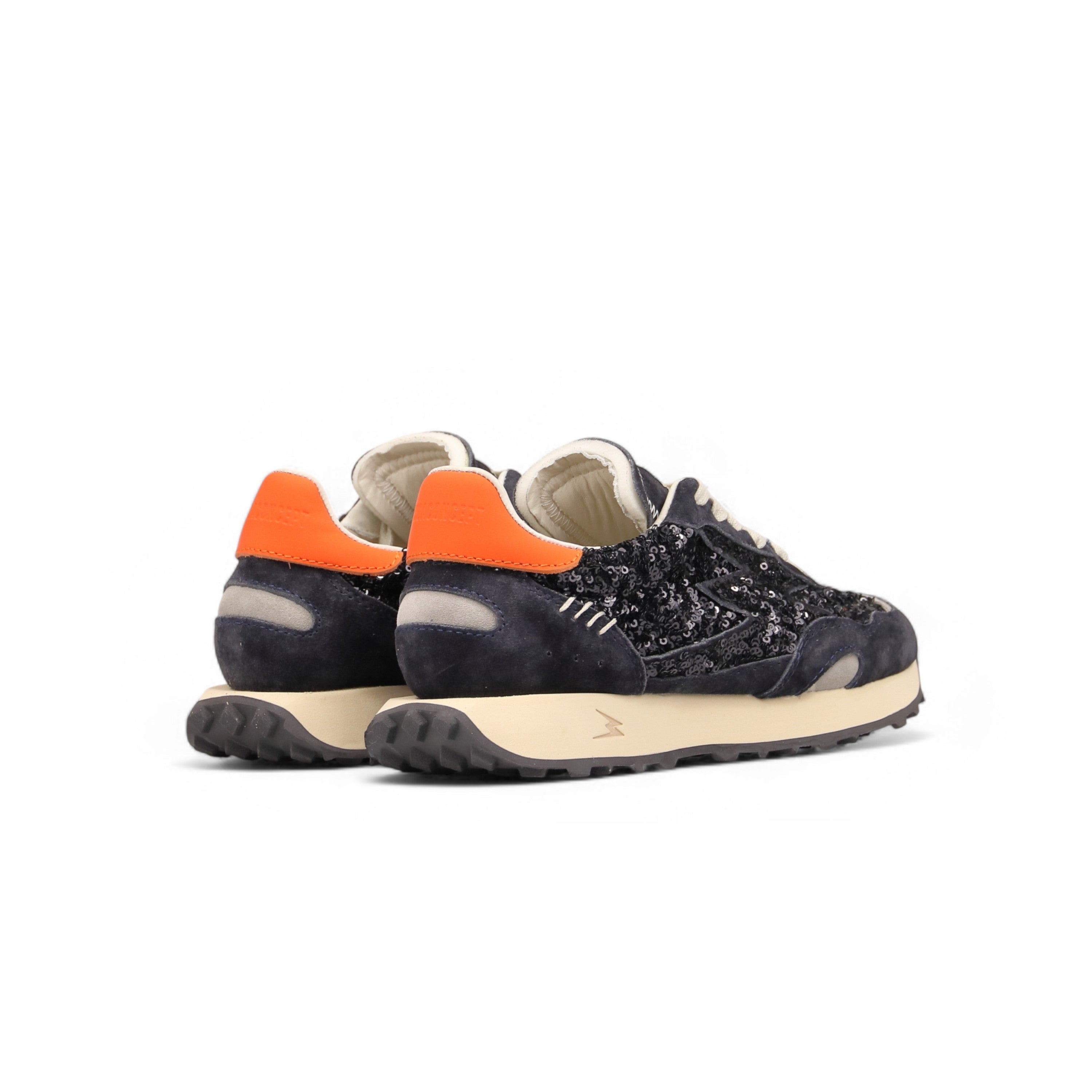 Nizki črni supergI, oblikovane v Italiji, z bleščicami, s črnimi semiš detajli, črnim logotipom z bleščicami in oranžnim nubuk zadnjim jezičkom. PODROBNOSTI:- Črn logotip z bleščicami- Črn semiš jezik- Dvobarven podplat iz vanilijevega EVA in črne gume- 3,2 cm visok podplat- Umazano bele bombažne vezalke z umazanim učinkom- Oranžen nubuk...