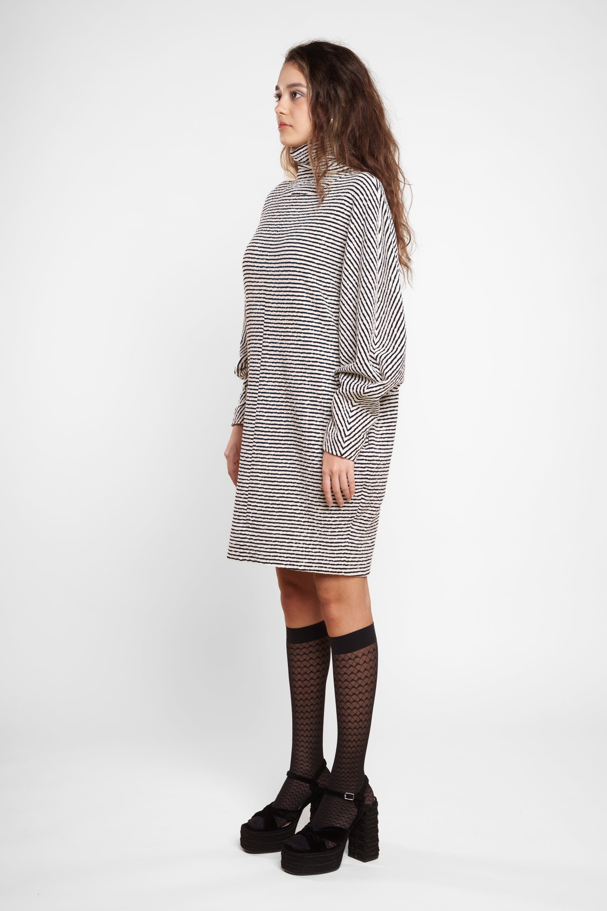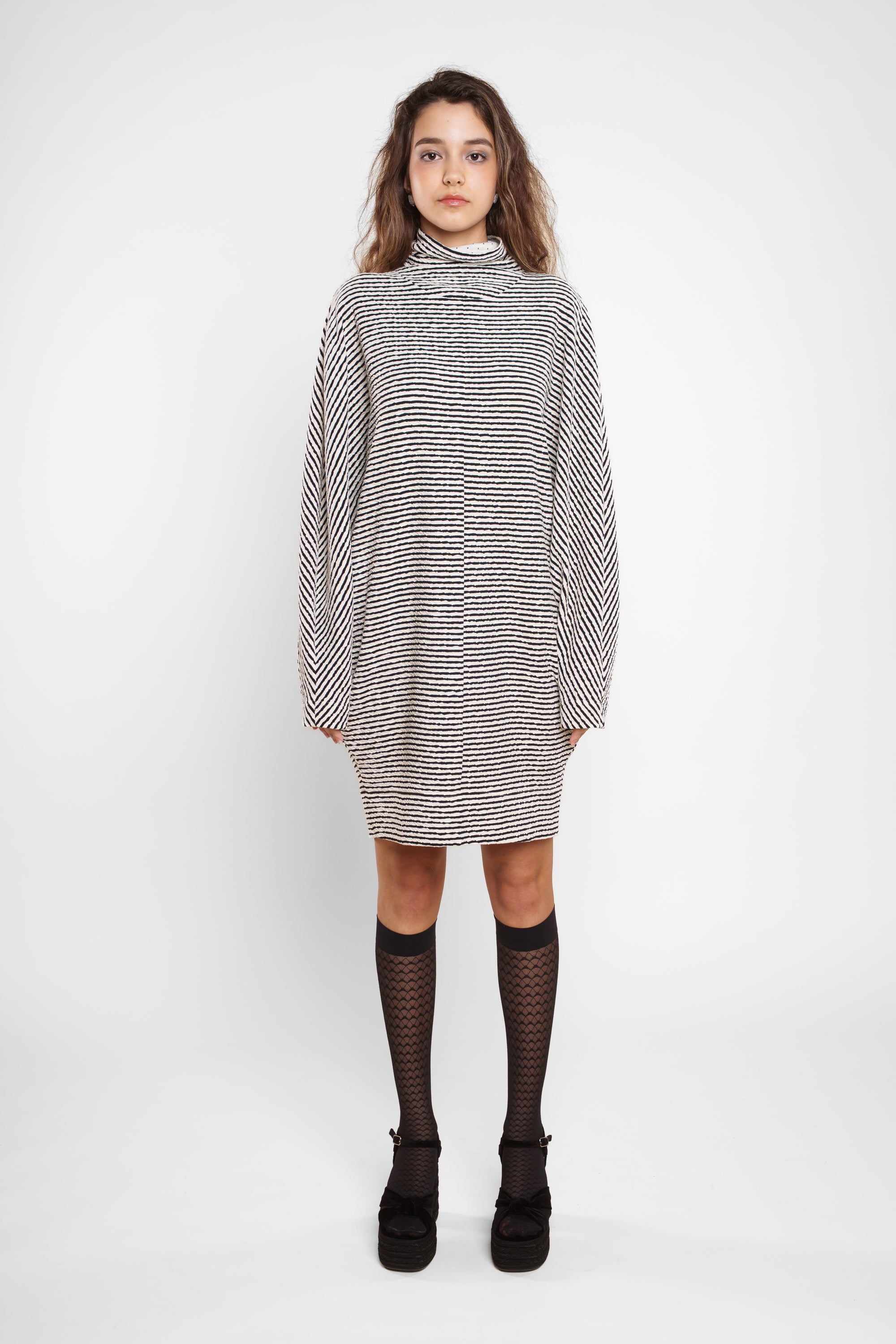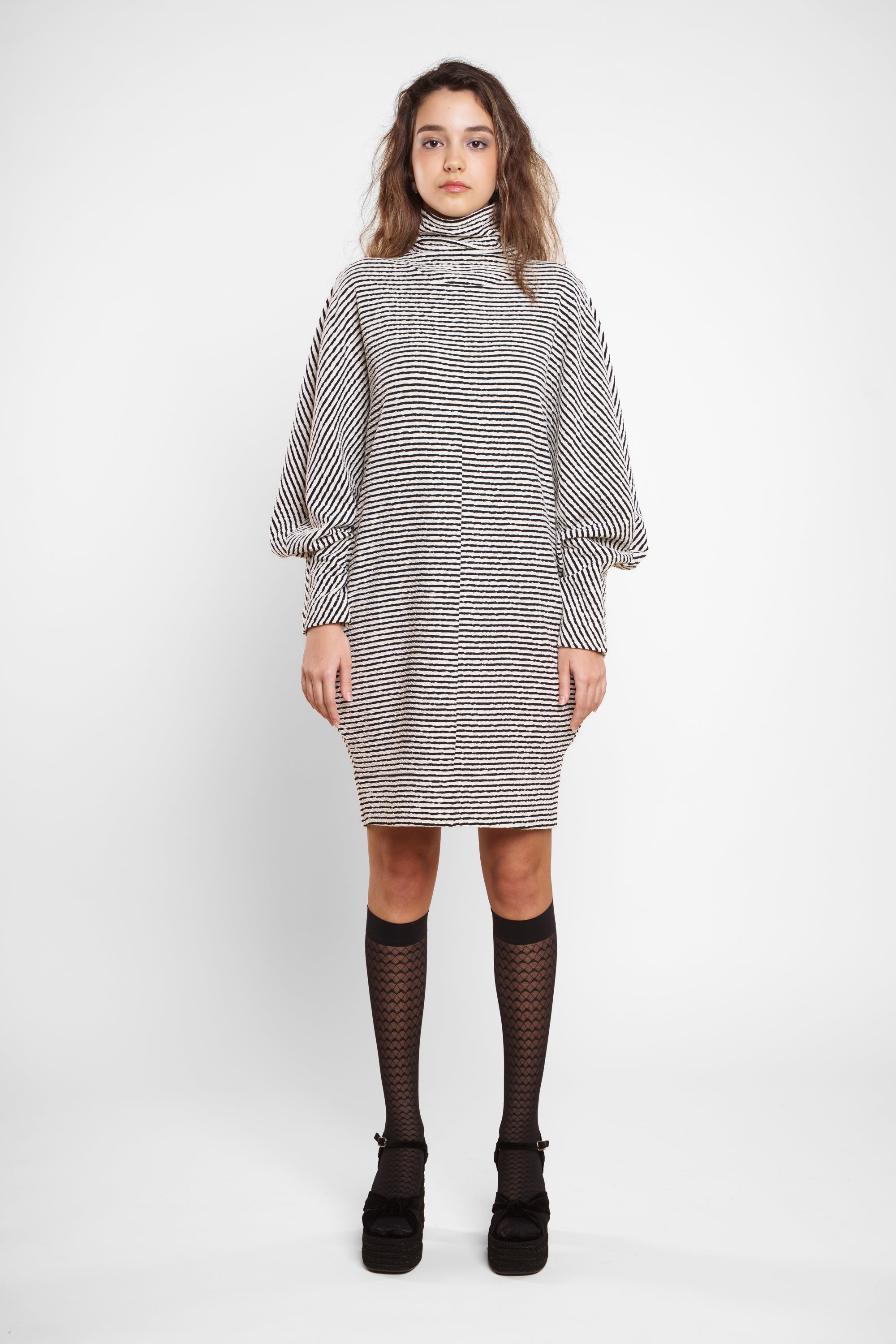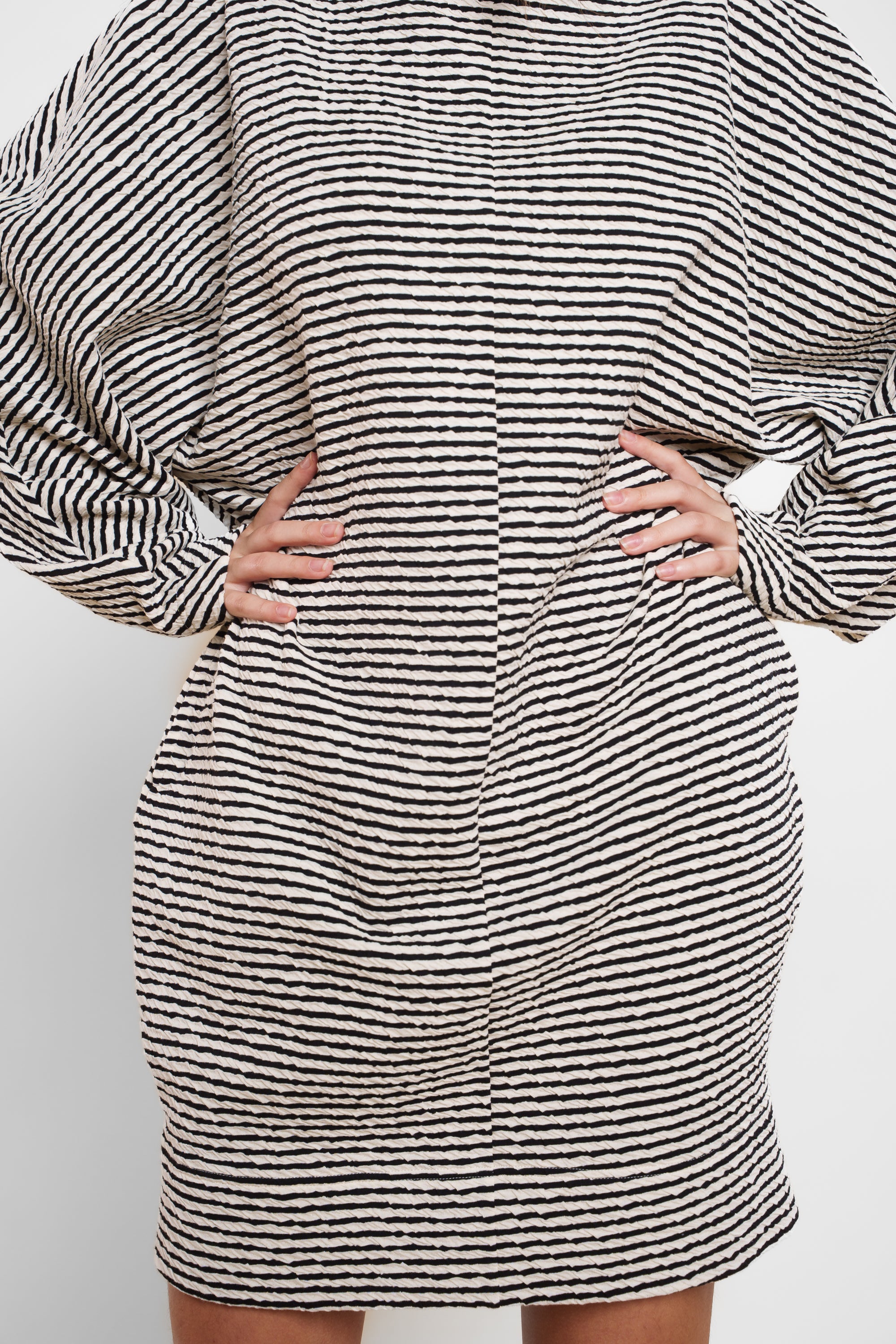 DIVA je črtasta obleka z izrazitim karakterjem in ženstveno silhueto. Mehka struktura iz 100 % bombaža se lepo prilagodi telesu, rahlo oprijet spodnji del pa ustvarja ravnovesje z voluminoznim zgornjim delom in visokim ovratnikom. Obleka je zasnovana kot »one size« model, ki se prilagodi različnim postavam in omogoča udoben, a...